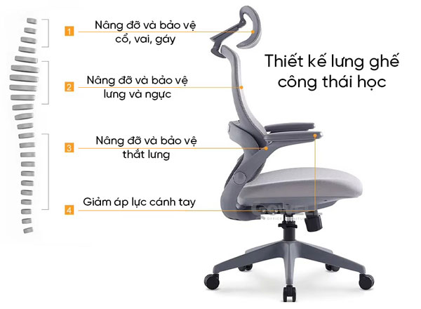 + Lưng ghế cao thiết kế đúng theo tiêu chuẩn Ergonomics với đường cong hình chữ S nâng đỡ cột sống lưng an toàn và tạo tư thế ngồi đúng, hạn chế đau nhức các khớp xương khi ngồi làm việc lâu.