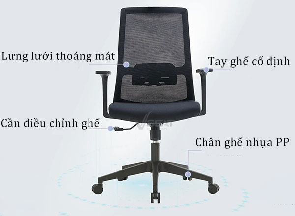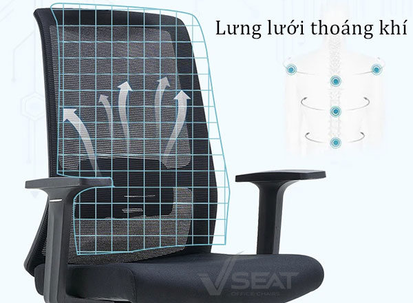 | Materials (Vật liệu) | Khung lưng bằng nhựa nylon PP. Tựa lưng bọc vải lưới cao cấp. Đệm đỡ lưng điều chỉnh độ cao thấp, ôm sát lưng người ngồi. |