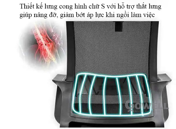 + Thiết kế ghế lưng trung. Lưng ghế cong hình chữ S vừa vặn với đường cong của lưng.