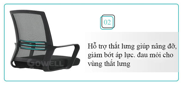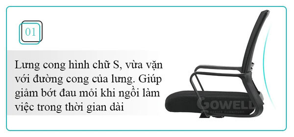 + Thiết kế ghế lưng trung. Lưng ghế cong hình chữ S vừa vặn với đường cong của lưng