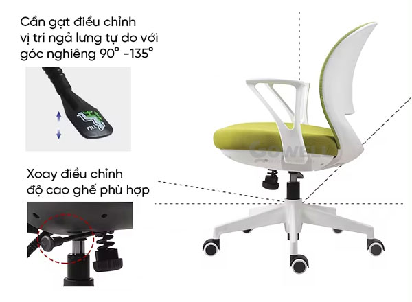 | Base (Chân ghế) | Chân nhựa PP tải trọng tốt, giữ cân bằng tạo cảm giác ngồi an toàn |