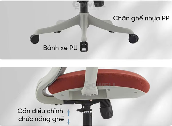 | Base (Chân ghế) | Chân nhựa PP tải trọng tốt, giữ cân bằng tạo cảm giác ngồi an toàn |