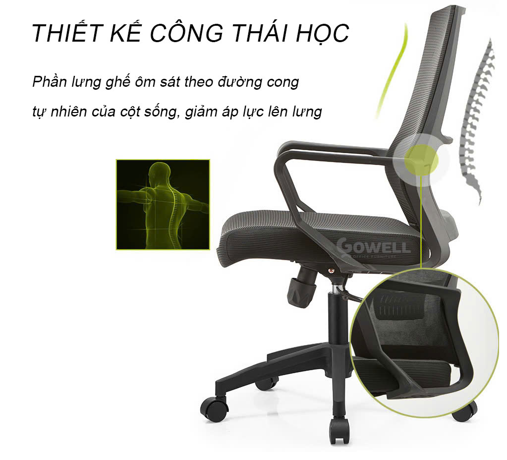 - Tựa lưng của ghế được thiết kế theo nguyên lý công thái học, ôm sát cột sống, giúp duy trì tư thế ngồi đúng và giảm căng thẳng cho lưng dưới. Đặc biệt, phần tựa lưng giúp hỗ trợ tốt vùng thắt lưng, hạn chế tình trạng đau mỏi lưng do ngồi lâu. Thiết kế này giúp bạn duy trì tư thế ngồi thẳng và giảm nguy cơ các vấn đề về cột sống trong thời gian dài.