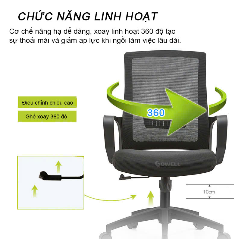 - Ghế được trang bị chân xoay hiện đại, có khả năng xoay 360 độ linh hoạt. Với thiết kế này, người sử dụng có thể dễ dàng di chuyển xung quanh không gian làm việc mà không phải đứng dậy, giúp tăng hiệu quả công việc và tiết kiệm thời gian.