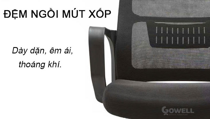 - Đệm ngồi mút xốp thấm hút mồ hôi khá tốt, giúp người ngồi cảm thấy thoải mái, khô ráo trong suốt thời gian làm việc. Tạo sự thoải mái cho người ngồi trong thời gian dài mà không gặp phải vấn đề đau nhức ở mông hay đùi.