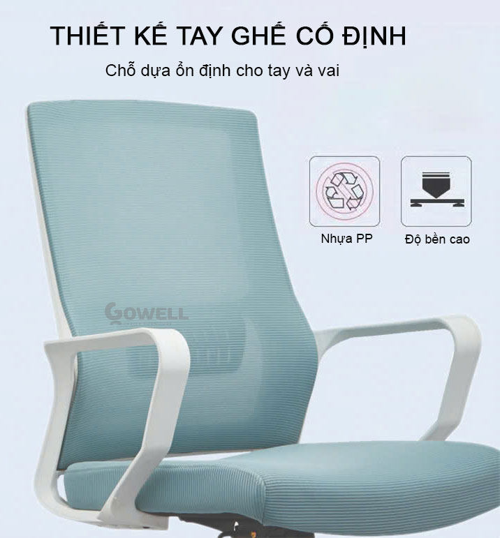 - Tay ghế cố định giúp người sử dụng có một điểm tựa vững vàng, giúp giảm bớt áp lực cho cánh tay và vai trong suốt thời gian làm việc dài. Điều này đặc biệt quan trọng đối với những người làm việc nhiều giờ liên tục tại văn phòng.