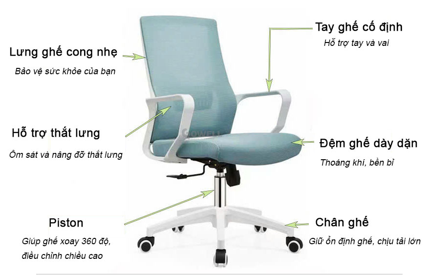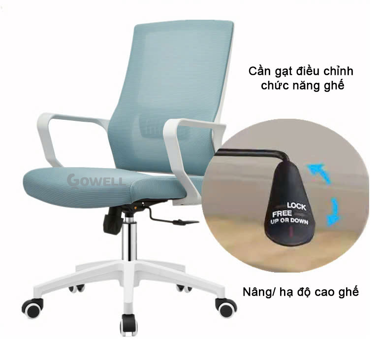 - Ghế được trang bị Piston để điều chỉnh chiều cao ghế. Bạn có thể dễ dàng điều chỉnh ghế lên hoặc xuống sao cho phù hợp với bàn làm việc, giúp tạo tư thế ngồi thoải mái và giảm mệt mỏi. Ngoài ra, ghế có cơ chế xoay 360 độ, giúp người sử dụng dễ dàng thay đổi vị trí mà không cần phải đứng dậy khỏi ghế. Điều này rất tiện lợi trong môi trường làm việc năng động.