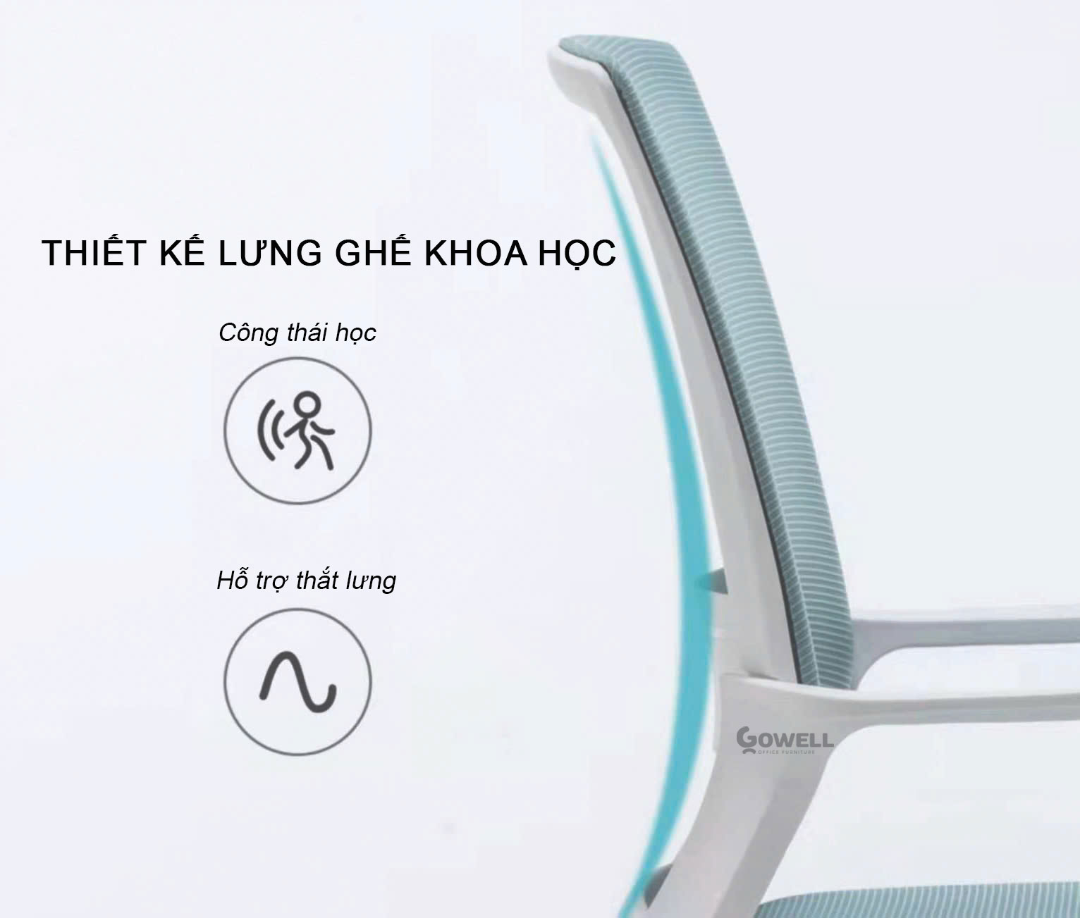 - Lưng ghế được thiết kế theo công thái học, giúp hỗ trợ tối đa cho lưng và cột sống, tạo cảm giác thoải mái khi ngồi lâu. Tựa lưng được làm từ lưới thoáng khí giúp người ngồi không bị nóng bức và mệt mỏi.