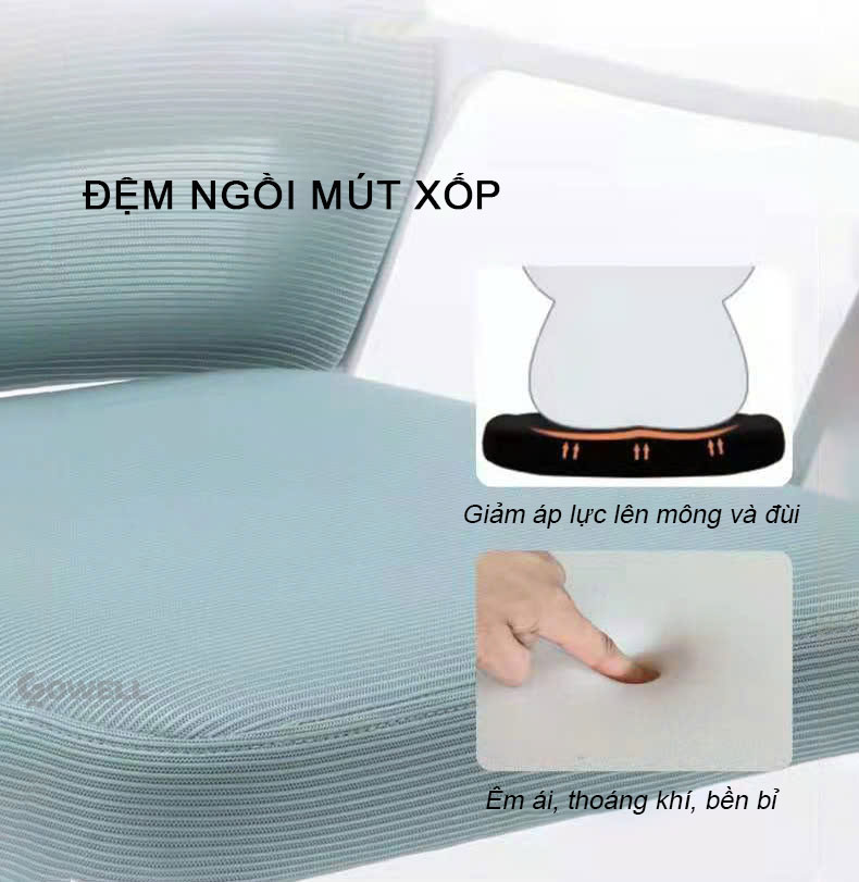 - Đệm ghế được bọc vải lưới, vừa tạo cảm giác thoáng mát, lại dễ dàng vệ sinh khi cần thiết. Đệm ngồi của ghế được thiết kế êm ái, vừa vặn với cơ thể người ngồi. Đệm ghế có độ dày hợp lý giúp phân bổ trọng lượng cơ thể đều, không gây đau mỏi khi ngồi lâu.