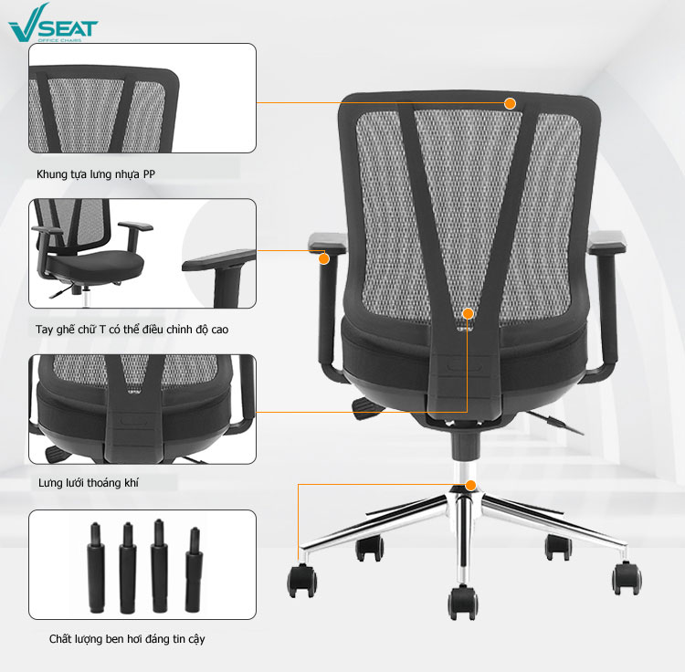 | Back (Lưng ghế) | Khung nhựa PP cao cấp bọc lưới cao cấp tạo lực căng theo định dạng khung tựa uốn cong hình chữ S |