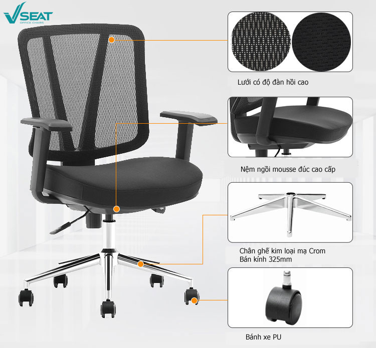| Back (Lưng ghế) | Khung nhựa PP cao cấp bọc lưới cao cấp tạo lực căng theo định dạng khung tựa uốn cong hình chữ S |