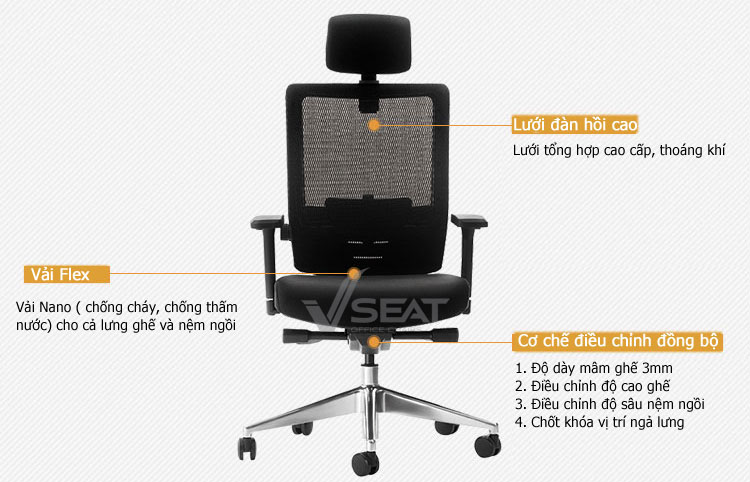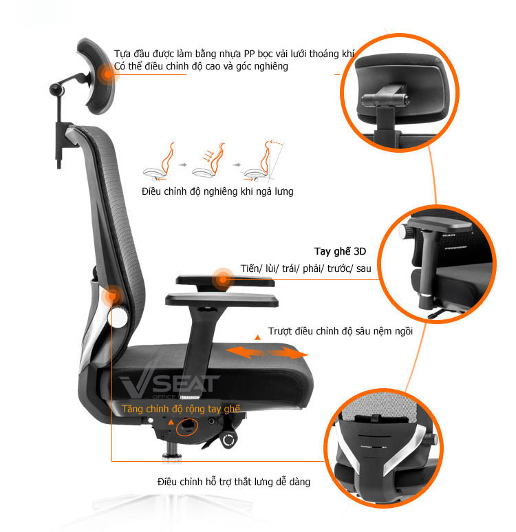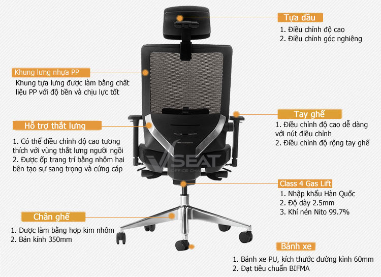 | Back (Lưng ghế) | Khung nhựa cao cấp bọc lưới, có hỗ trợ điều chỉnh thắt lưng |
