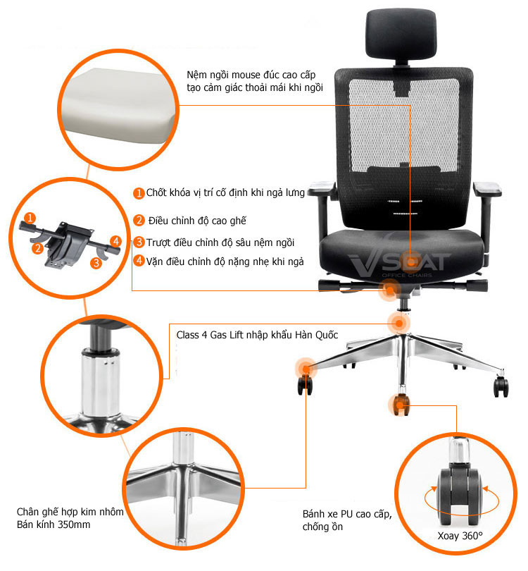 | Gas lift (Pen hơi) | Pel cao cấp – nâng hạ chiều cao, đạt tiêu chuẩn BIFMA. |