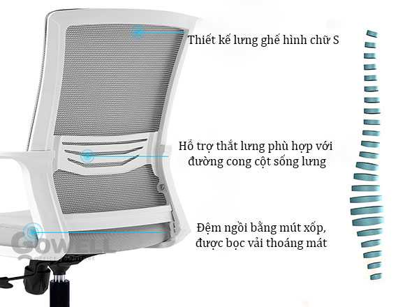 + Tựa lưng trung thiết kế với đường cong theo dạng hình chữ S, giúp đẩy xương sống lưng, ngực trả về độ cong sinh lý tự nhiên của cột sống, mang đến cảm giác ngồi thoải mái nhất.