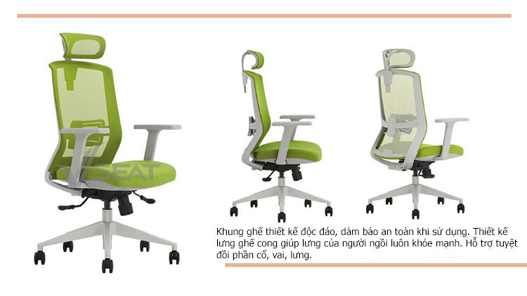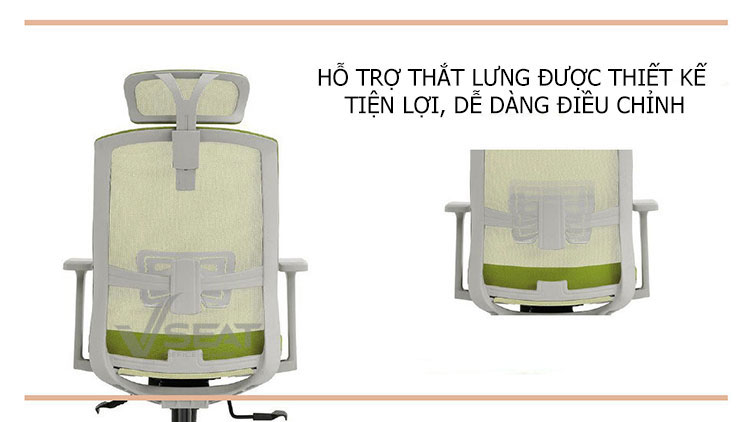 – Thiết kế lưng ghế công thái học ôm sát và nâng đỡ phần vai, ngực, thắt lưng. Hỗ trợ thắt lưng được thiết kế điều chỉnh dễ dàng giúp nâng đỡ phần thắt lưng người ngồi, giảm bớt các bệnh lý văn phòng khi ngồi làm việc trong thời gian dài.