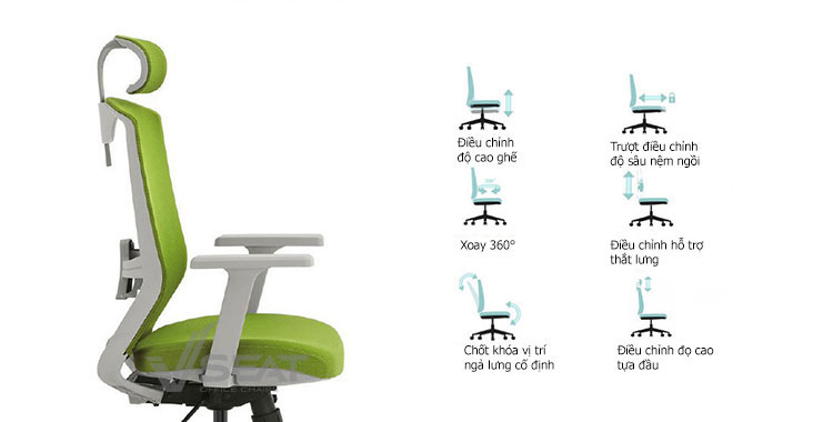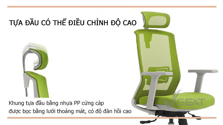 – Tựa đầu được bọc bằng vải lưới thoáng khí, độ đàn hồi cao. Tựa đầu có thể điều chỉnh độ cao và góc nghiêng dễ dàng giúp nâng đỡ, giảm bớt áp lực cho đầu và cổ.