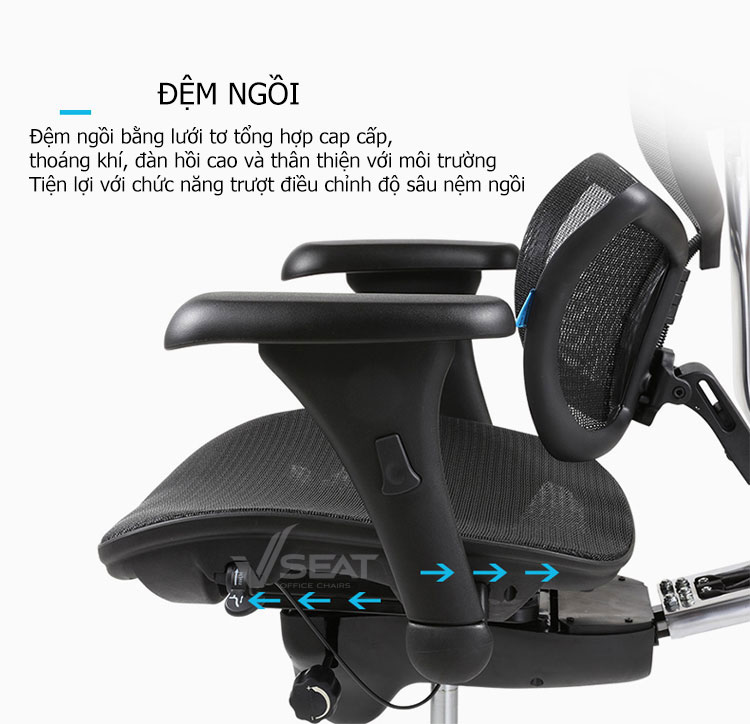 | Seat (Đệm ngồi) | Đệm ngồi thiết kế bọc lưới thoáng mát, giúp giảm áp lực lên khớp gối, hạn chế tê nhức các khớp xương. Có thể điều chỉnh độ sâu đệm ngồi phù hợp với mọi nhu cầu của người sử dụng |
