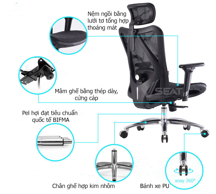 | Seat (Đệm ngồi) | Đệm ngồi thiết kế bọc lưới thoáng mát, giúp giảm áp lực lên khớp gối, hạn chế tê nhức các khớp xương. |