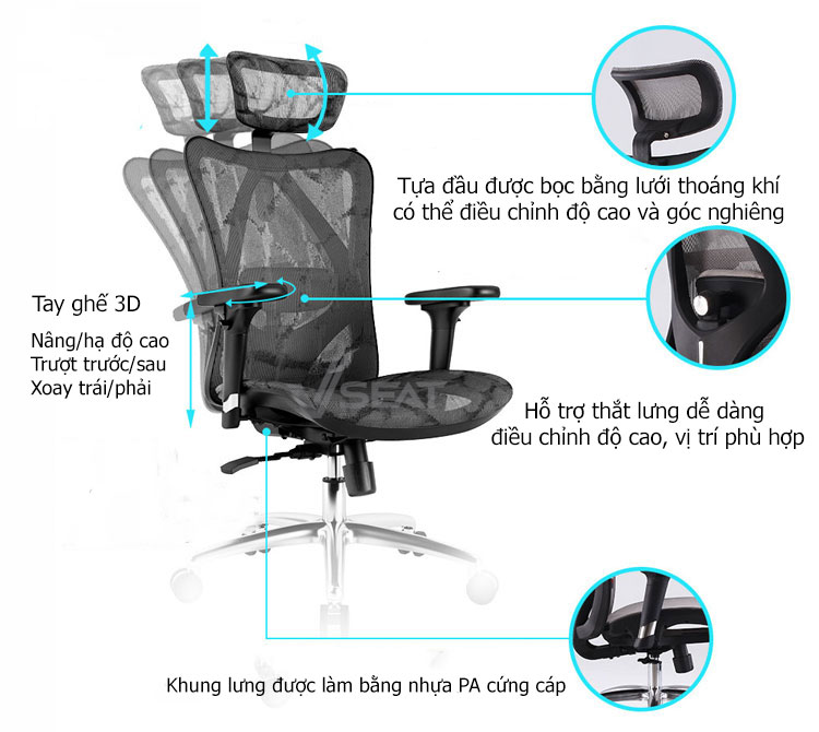 Ghế Sihoo M57 khung đen có gác chân thuộc thương hiệu Sihoo được Vseat nhập khẩu 100% chính hãng, ghế hỗ trợ sức khỏe Ergonomic