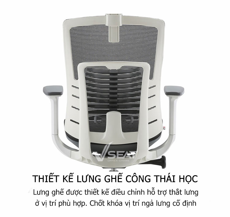 | Back (Lưng ghế) | Lưng ghế thiết kế tách rời phần đỡ thắt lưng, ôm sát lưng người ngồi tạo điểm tựa hợp lý giúp cột sống được nâng đỡ, giảm thiểu mệt mỏi khi ngồi làm việc thời gian dài. |
