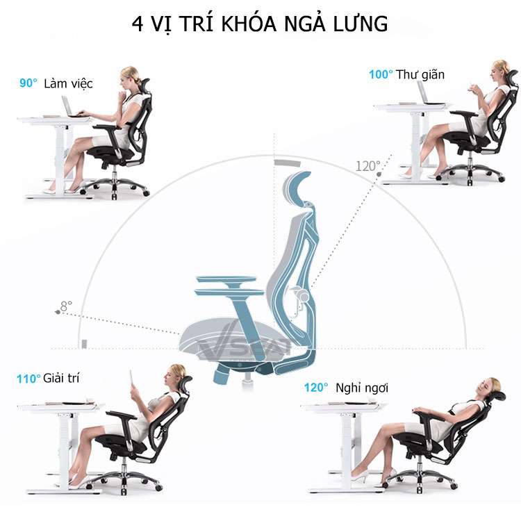 | Mechanism (Bộ điều khiển) | Mâm ghế có cơ chế ngả lưng 90 – 120 độ, khóa cố định 4 vị trí cho phép người dùng linh hoạt điều chỉnh tăng giảm độ cao, ngả lưng theo nhiều góc độ phù hợp với nhu cầu làm việc, giải trí, nghỉ ngơi. |