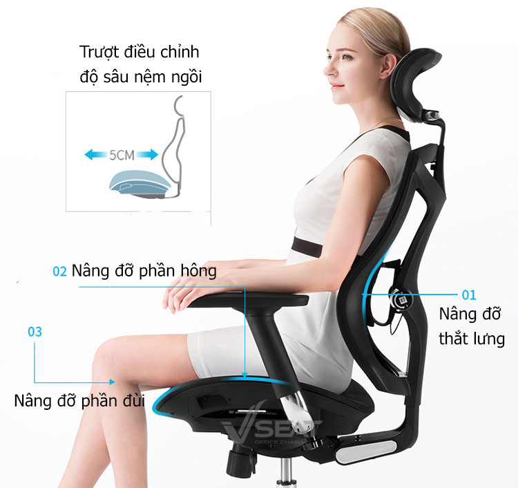 | Seat (Đệm ngồi) | Đệm ngồi thiết kế bọc lưới thoáng mát, giúp giảm áp lực lên khớp gối, hạn chế tê nhức các khớp xương. Có thể điều chỉnh độ sâu đệm ngồi phù hợp với mọi nhu cầu của người sử dụng |