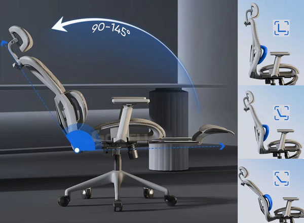 + Ghế thiết kế có gác chân rất tiện dụng với cơ chế kéo về phía trước nằm gác chân thư giản và đồng thời gập lại đẩy gọn vào bên dưới mặt đệm khi ngồi làm việc.