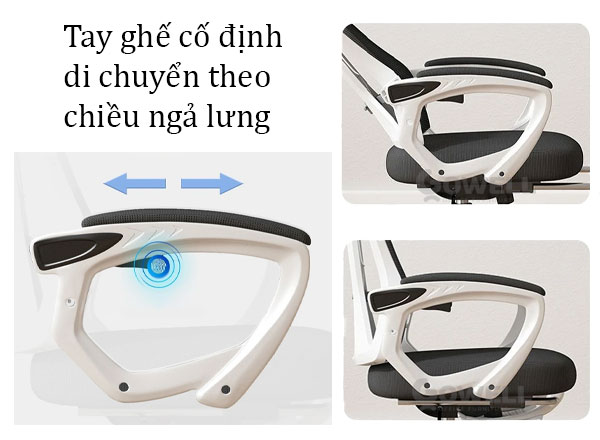 | Armrest (Tay ghế) | Tựa tay bằng nhựa PP, bề mặt bằng chất liệu vải hoặc PU êm ái. Chống căng mỏi cơ vai – tay. |