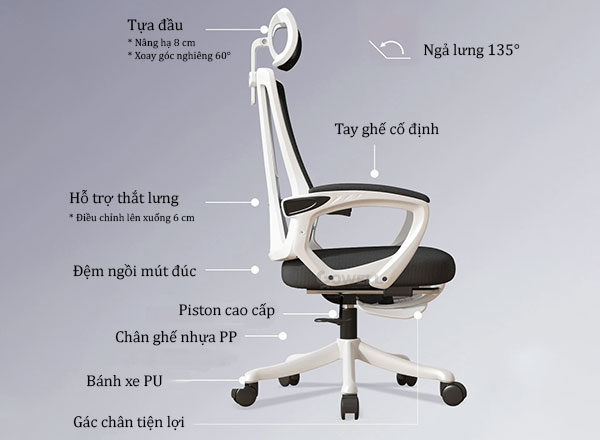 | Mechanism (Bộ điều khiển) | Hệ thống điều khiển mâm 2 cần hiện đại, tăng chỉnh độ cao ghế và chốt khóa ngã lưng tùy mục đích sử dụng. |