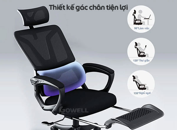 + Ghế thiết kế có gác chân rất tiện dụng với cơ chế kéo về phía trước nằm gác chân thư giản và đồng thời gập lại đẩy gọn vào bên dưới mặt đệm khi ngồi làm việc.