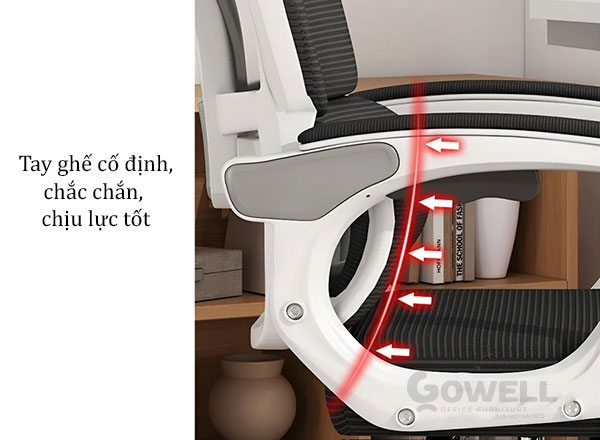 | Armrest (Tay ghế) | Tựa tay bằng nhựa PP, bề mặt bằng chất liệu vải hoặc PU êm ái. Chống căng mỏi cơ vai – tay. |