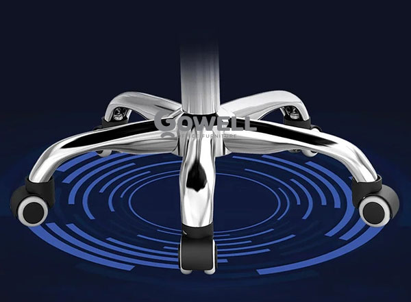 + Chân ghế được làm từ chất liệu sắt mạ Chrome bền đẹp, hạn chế hoen gỉ, sử dụng 5 bánh xe nhựa nylon giúp người ngồi xoay và di chuyển ghế dễ dàng.