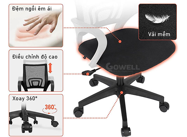 + Khung tựa nhựa PP dày bọc vải lưới cao cấp có thể chịu lực tốt, giảm sự tích nhiệt khi sử dụng trong thời gian dài.