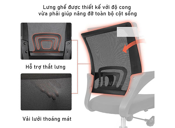 + Lưng ghế được thiết kế với độ cong vừa phải giúp nâng đỡ toàn bộ cột sống, giúp người ngồi tránh bị đau lưng nhức mỏi khi tựa.