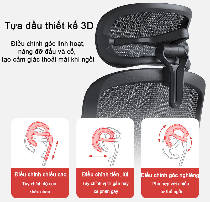 - Điều chỉnh tiến- lùi: Điều chỉnh vị trí gần hay xa phần gáy, để ôm sát cổ tốt hơn. Giúp giảm mỏi cổ, vai gáy khi ngồi lâu. Linh hoạt cho người cao thấp khác nhau.